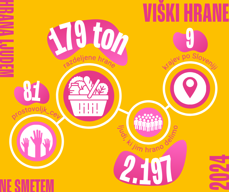 Hrano razvaža in deli ekipa prostovoljcev, ki viške hrane prevzemajo na različnih lokacijah (v kuhinjah šol, dijaških domov oz. restavracij) in jo na našem sedežu razdelijo uporabnikom. Hrano razvažajo tudi na domove, in sicer družinam, za katere je prevzem na našem sedežu prevelika ovira. Projekt v veliki meri izvajamo prostovoljsko, vendar pri tem nastajajo tudi stroški (koordinacije, posod za shranjevanje hrane, goriva za prevoz hrane in potni stroški prostovoljcev).